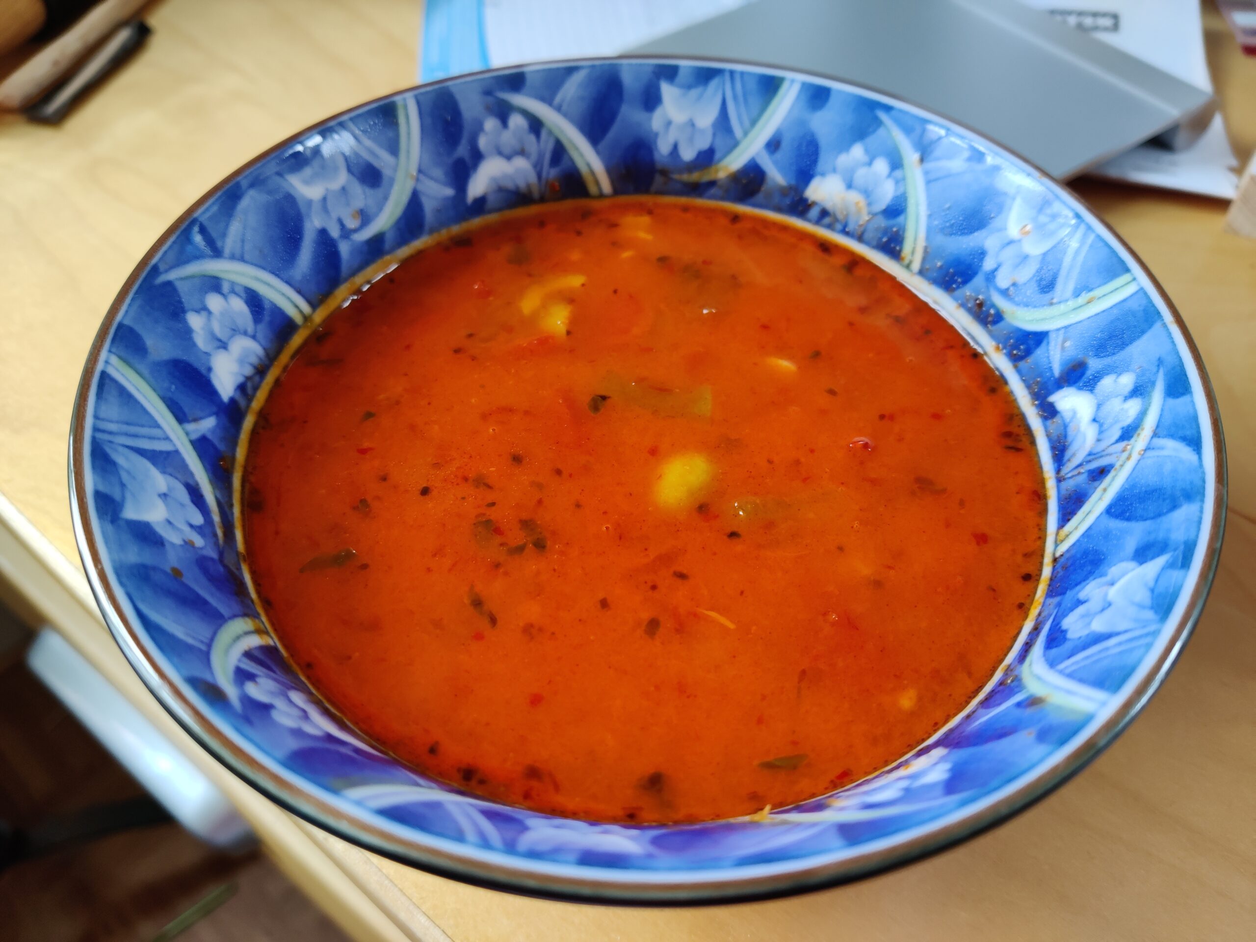 En enkel, värmande soppa med sånt vi brukar ha hemma (annars får man anpassa den till det man har 🙂 ). I en kastrull: fräs några msk olivolja, hackad eller pressad vitlök, ett par msk paprikapurè (stark eller inte) och lite tomatpurè. Tillsätt tunna strimlor av röd och grön paprika och 1 stor tomat (eller […]